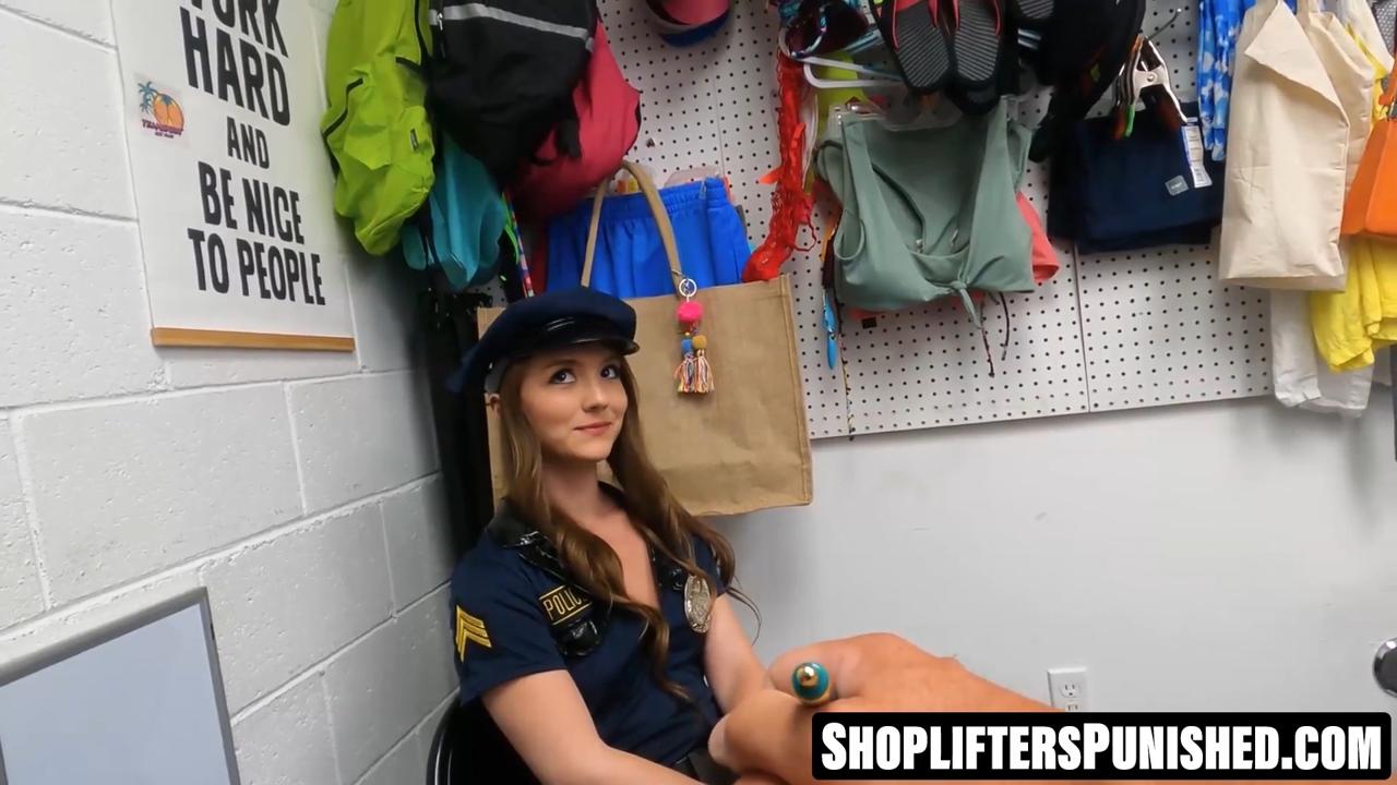 Curvy teen Mira Monroe gets caught shoplifting and gets punished by Rusty Nails. She sucks his cock in missionary, then grinds on him in reverse cowgirl. He fucks her in cowgirl and side fuck before blowing his load in her mouth.